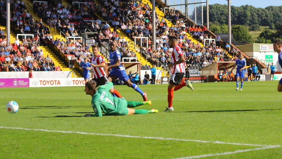 It was a quiet opening to the game but this changed in the sixth minute when, after a Nathan Arnold free-kick was kept alive by the Imps, Alex Woodyard chipped in a peach of a cross and there to head home from six yards was SEAN RAGGETT for his first goal in City colours.