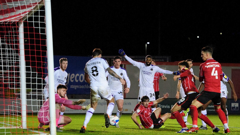 The home side continued to press and were inches away from a leveller as the ball fell to Remy Howarth on the edge of the box, but his volley agonisingly bounced off the post and Shrewsbury cleared.