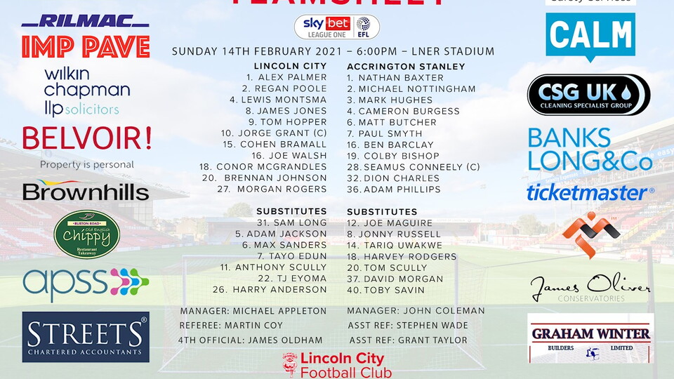 Club news 210214 Accrington Teamsheet 14th February 2021 Imps fans can download our official team sheet from tonight's Sky Bet League One match against Accrington Stanley. To do this, simply click the PDF link at the bottom of the article and save this to your device. Accrington Stanley Team Sheet.pdf