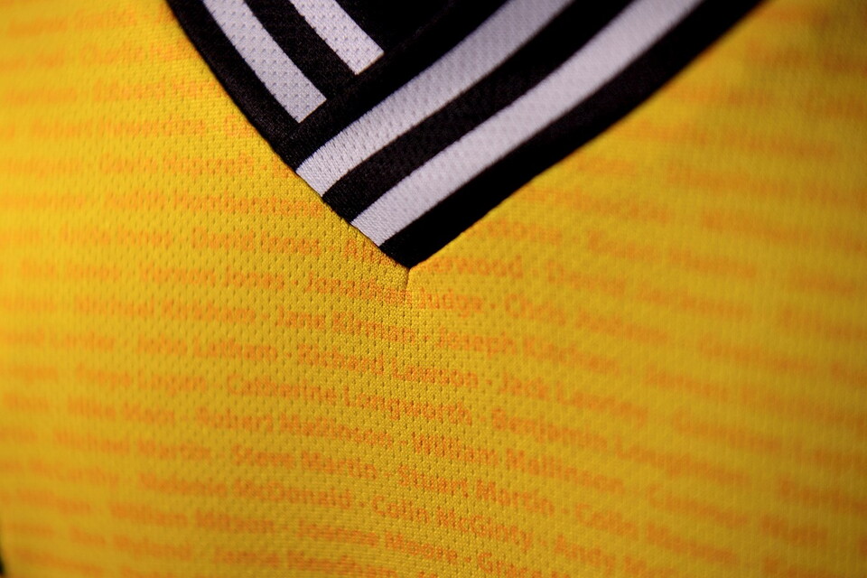 Please note that if a name is covered by a badge or sponsor on the shirt, it will feature elsewhere as the names are repeated twice.