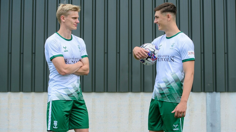 Predominantly white, with flashes of Lincoln Green, the away shirt is sponsored by the University of Lincoln who have extended their diamond partnership with the club.